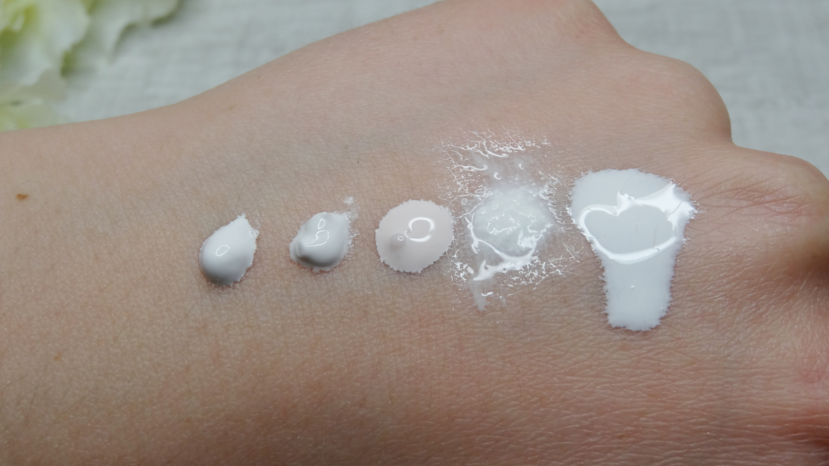 Poniżej prezentuję ich moc rozjaśniania. Nie bierzcie tego jednak bardzo dosłownie. Zarówno podkładu jest "mniej więcej" tyle samo, choć na zdjęciu widać, że bywa różnie, jak i rozjaśniaczy jest "mniej więcej" tyle samo. Starałam się, ale niestety nie są to warunki laboratoryjne, by zbadać temat kropka w kropkę. Musicie mi więc uwierzyć na słowo (po wcześniejszych opisach) jaka jest ich moc i pigmentacja. Jako podkład bazowy posłużył mi Revlon Colorstay 150 Buff (combination/oily skin).
